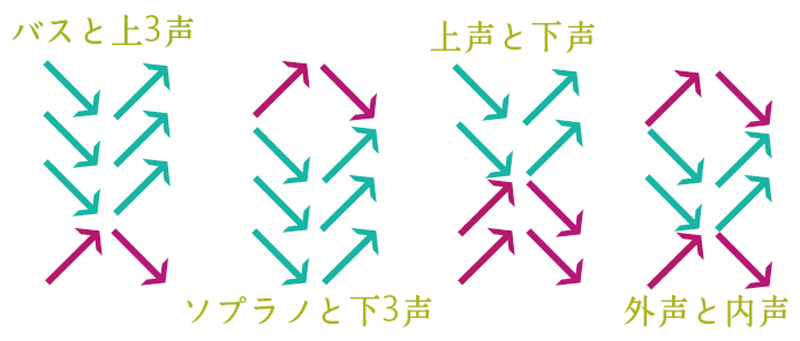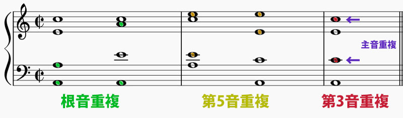重複は根音か第5音で行い、第3音は使いません。しかし主音、属音、下属音のいずれかは第3音でも重複できます。この四声部を構成する和音を美しく連結するのは条件があります。