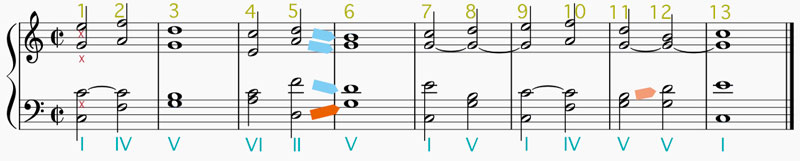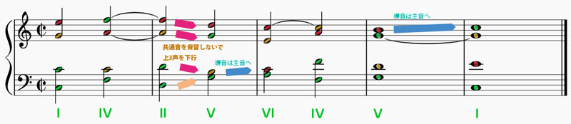 1箇所の例外(VI)以外は根音を重ねて4つの音を構成しています。VIは主音を重ねています。Vには導音(シ)が含まれ、シは必ずドに進行しますのでIかVIを連結します。II→Vは、保留せずに上3声を下降させるのが最適配置になります。特に短調の場合は重要です。