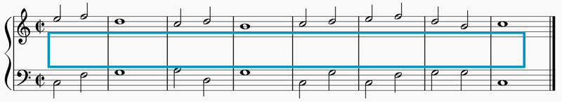 前項で制作しました2声の譜に内声を足します。三和音の内、2つがすでに使われていますので、残った2つ(1つは重ねる)をスペースに埋めていきます。内声は極力保留するのが原則です。