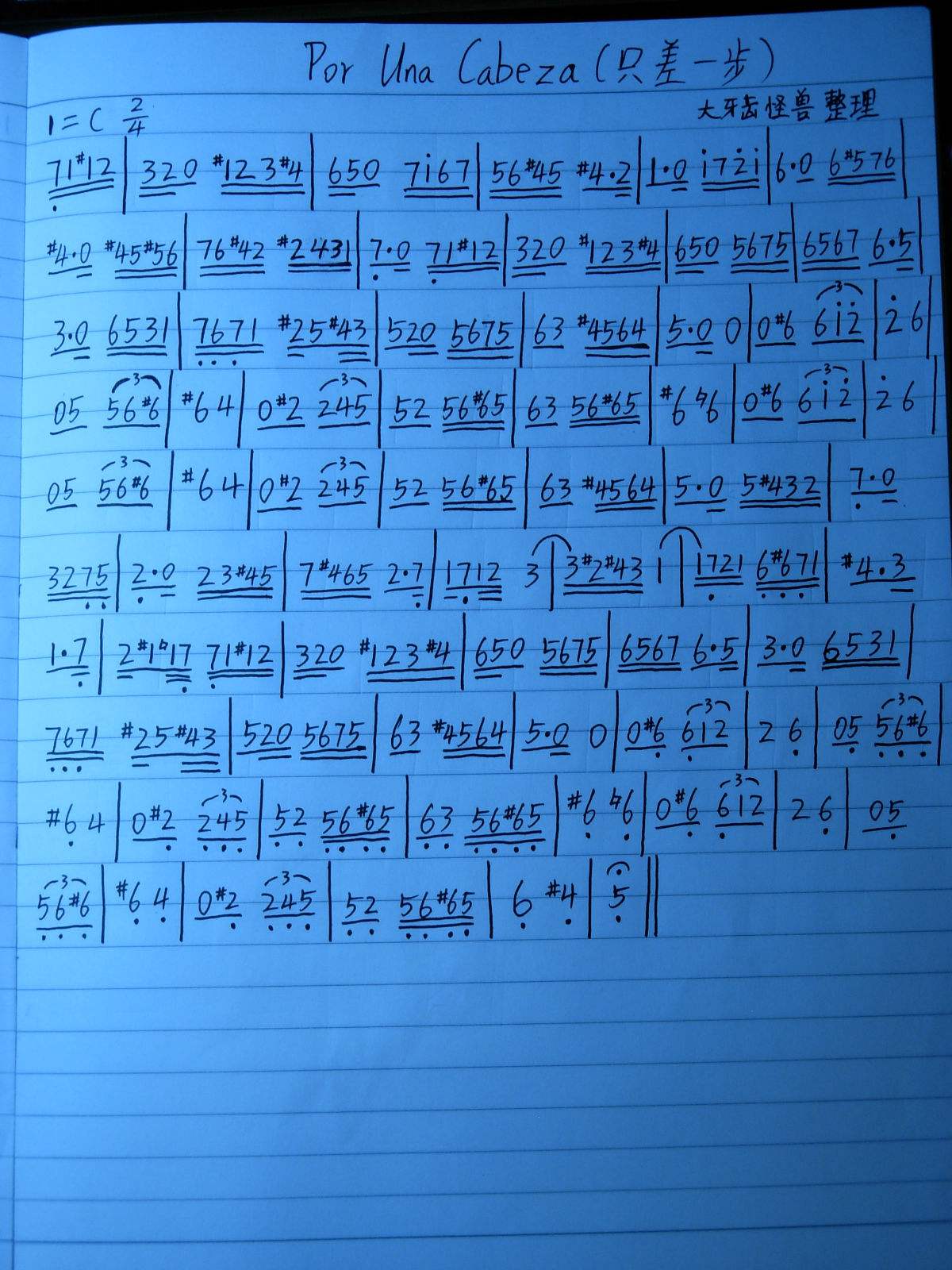編成の少ない例としてはピアノかギターに合わせるという状況が想定されますが、ギターの場合、一例として動画のような感じになったりします。弦堂の到着より前に韓軍が先に北京に着いたので数日待つ間蒋山の家に居候した模様で、暇を持て余したのか近所にある蒋山の録音室で収録して送ってきたものです。蒋山は「中国のディラン」(笑)と呼ばれている吟遊詩人で、言葉というものに非常にこだわっておられます。それで弦堂に会うと「なんだ、お前の中国語水準の低さは? 適当に喋りやがって!」と罵り、そして悶えます(苦笑)。わかりやすい無礼者です。その男が無言でギター?。珍しい映像です。サングラスなどの小道具は蒋山の商売道具と思われ、そこは彼の工作室であるから、この怪し過ぎるシチリア風の演出については全面的に彼のプロデュースだったのは間違いないところです。ネットからダウンロードしてきたものですが念のため楽譜も用意しておきます。二胡は決して音量の大きい楽器ではないですが、ギターはもっと小さくなります。彼らはそこは全く気にしていないようです。ギターの音は本当に小さいですが、それよりも適切な表現を重視していることが伺われます。韓軍が持っている二胡は安価な黒檀です。無名の若い人が作っており腕は非常に優秀です。しかし如何せん名前がありません。この動画を確認した呂建華は「これは私が作った二胡ですか」と聞いてきました。「自分の二胡に非常に似ている」と。確かにその通りで、その話を韓軍にすると「あなたの言う地方による音色の違いというのはそういう概念は我々にはない」「北京とか蘇州とかそんなものはなくて、ただ個人が優秀かどうかという感覚しかない」「しかし呂建華は自分の二胡に似ているという。確かにその通りではある」などと言いました。弦堂は「上海と蘇州、また北京と天津はだいぶん違うよ」「彼らはあまねく伝統的ツリーの下に連なっている。その中で修行したのだから、北京で修行したなら北京の音になるのは当然だ」と大雑把にはこういう話をしました。天津派がなぜ北京と異なるのかという話などもしました。南方の楽器も最近ではバイオリンに近くなってきていますが、どちらかというと北京派の楽器で西洋曲を合わせられる場合が多いと思うし、同じ北方の楽器でも天津のものは難しいと思います。