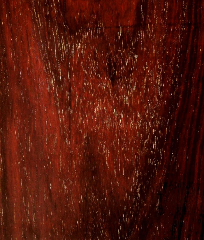 「金星(jin-xing)」です。この例は印度紫檀ですが他の材でも現れます。金星は完全に金色です。必ず輝く金色です。キラキラしています。他には白や黒もあり、これは金星と言いませんが同様に評価に値する材です。木材の毛細血管が吸い上げる地中の鉱物が煌くのですが鉱物の種類によって色が変わります。土地によってミネラルが変わりますので産地は非常に重要です。赤土、或いは朱泥が広がっている土地はほとんどの場合、金そのものもあります。埋蔵量によっては金山になります。金星はそういう土地の樹木から出る金そのものです。輝いているので不純物をある程度含有した金です。インド紫檀は南部のカルナータカ、アンドラ・プラデーシュ両州の山地に分布しています。密採者が警察に射殺されている映像が報道されることもあり、傍らには紫檀の丸太、あたり一面は赤土です(金の産出については泥についても参照)。金は元素なので本質的に何なのかわからないのですが、それは錫、銅、銀についても同じでいずれも強い浄化抗菌作用があります。銅鍋で料理をするとか、錫器で酒を飲む、欧州貴族の邸宅や教会では銀器で食事されるといった例がありますが、特に金は最高で、古代の王族が金を集めたのは主にそのため、金で飾ることによって神聖さを表しました。現代でも鍼や歯科、結核の治療などに使われています。浄化能力に関しては金よりも銀の方が優れているという分析もあり、銀の採掘が難しかった古代では金よりも価値があるとされていたこともありました。おそらくこの背景から王族は黄金の衣を身につけ、宗教関係者はそれより上位の銀を表す白衣を身につけていたのかもしれません。しかし銀は磨き続けないと黒くなってしまいます。天然の金には10%程の銀が含まれるし、金山からは銀も銅も産出します。このようなミネラルが木の血管を伝って内部に入ればより細胞組織が安定し硬く締まった材になるので、そのため金星が出ている材は良いものが多いと判断されます。しかしこれが白や黒に劣るとも一概には言えません。金にニッケルが混じると白くなるし、銀の含有量が増えても同様です。金が細かい粒子状になれば黒くなります。鉄やアルミが混じっても色は濃くなります。銅が混じると赤っぽくなり血管が見えにくくなります。ですから見えるものは参考に過ぎず、最終的には材の個体をみて判断するしかありません。