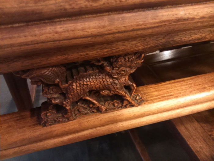 「水波紋(shui-po-wen)」という水の波のような紋が見られる材も非常に良いものです。写真の例のような非常に細かいものは海南花梨の特徴ですが、非常に細かく滲むように表出するものは他の材でもあります。